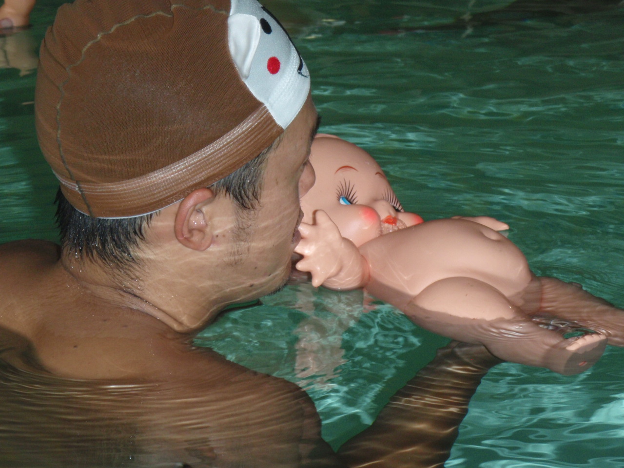 珍しくマジメにベビースイミングの補助の練習をするタッキー