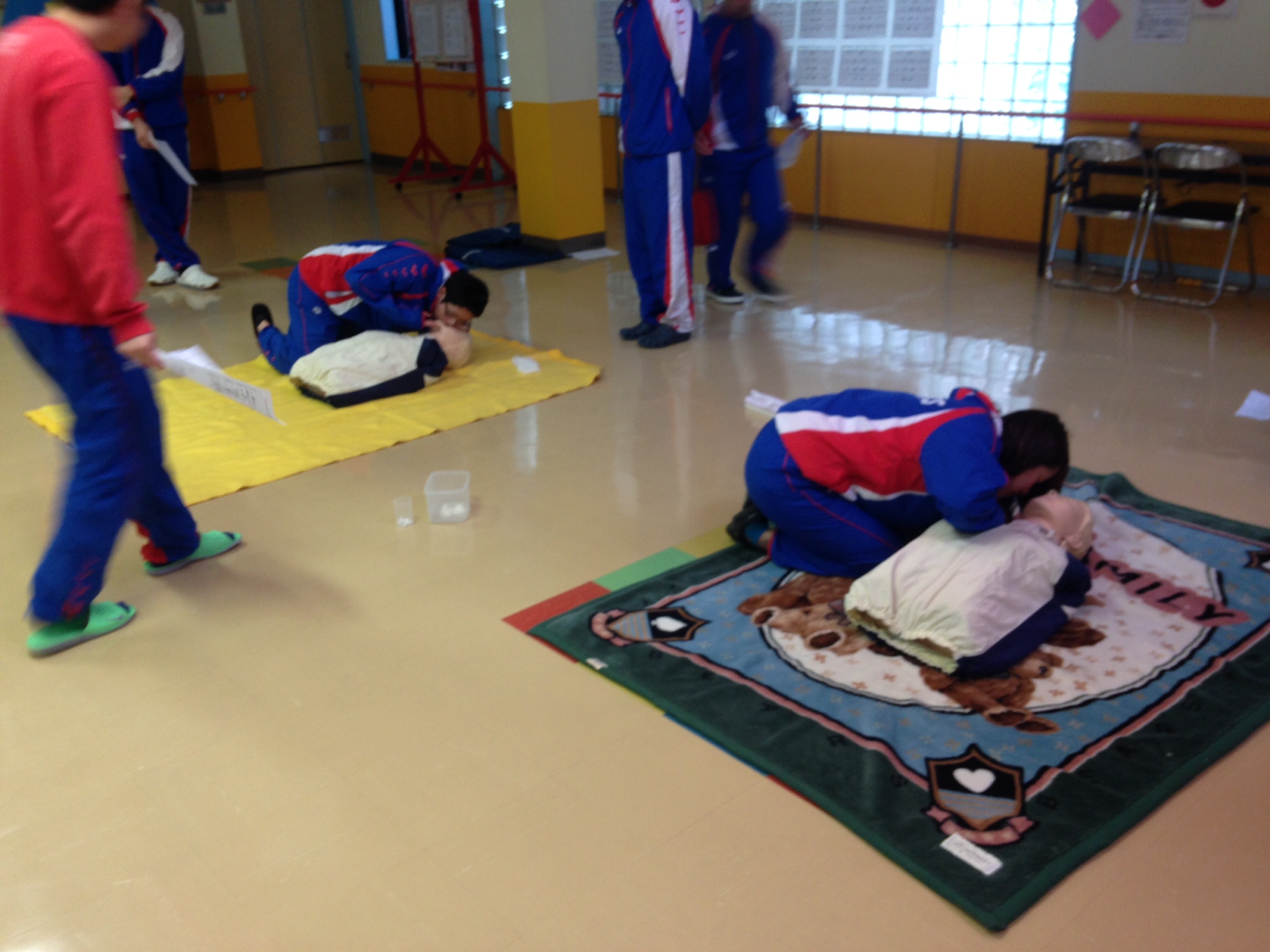 先日、消防署より心配蘇生法の訓練用人形を2体拝借し、CPR(CardioPulmonary Resuscitation:心配蘇生法)の練習を行いました。