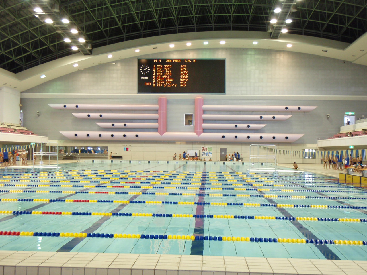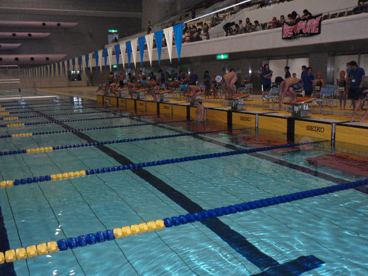 電光掲示板のあるこんなにでっかいプールで泳ぐ機会なんて滅多にない。だからピュアでは普段できない経験をしてほしくて、グランディーで水泳大会をしています。