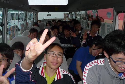 朝4時50分出発。満員のバスなのにみんなゲンキいっぱいです。