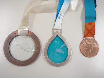 写真がそのメダル。右側の一番ちっこいのがアテネの銅メダルです。
