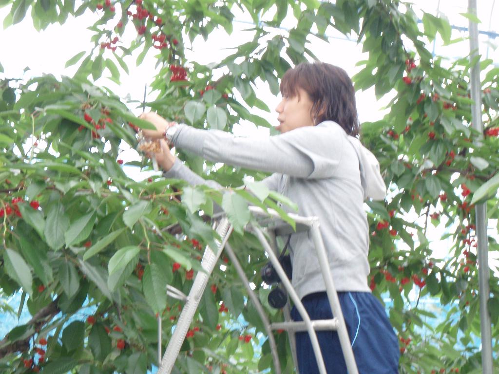 人生初のさくらんぼ狩りに夢中になる中西選手。