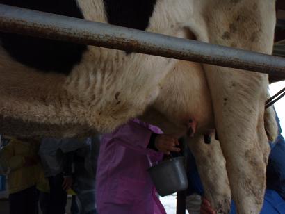 まず最初に牛の乳搾り。現地に到着したとたん風が強く乳搾りがとても大変でした。